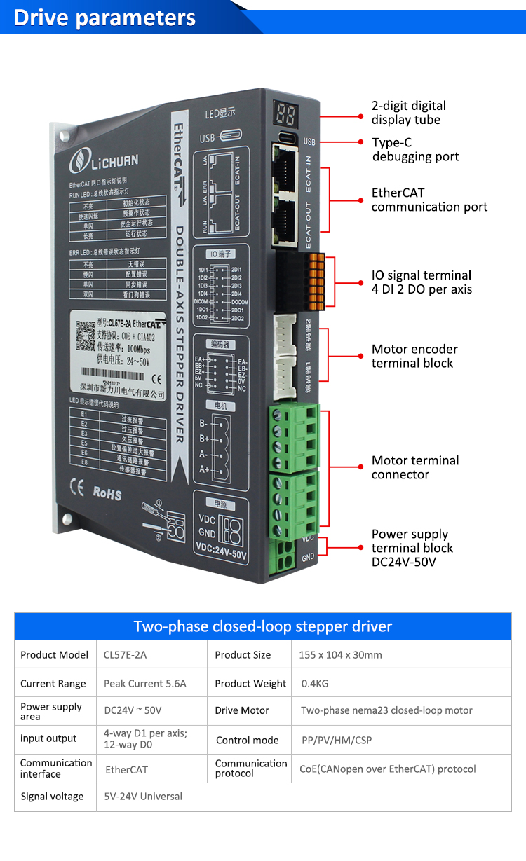 EtherCAT 2-faasiline Nema17 2-teljeline alalisvoolu suletud ahelaga samm-mootori draiverite komplekt